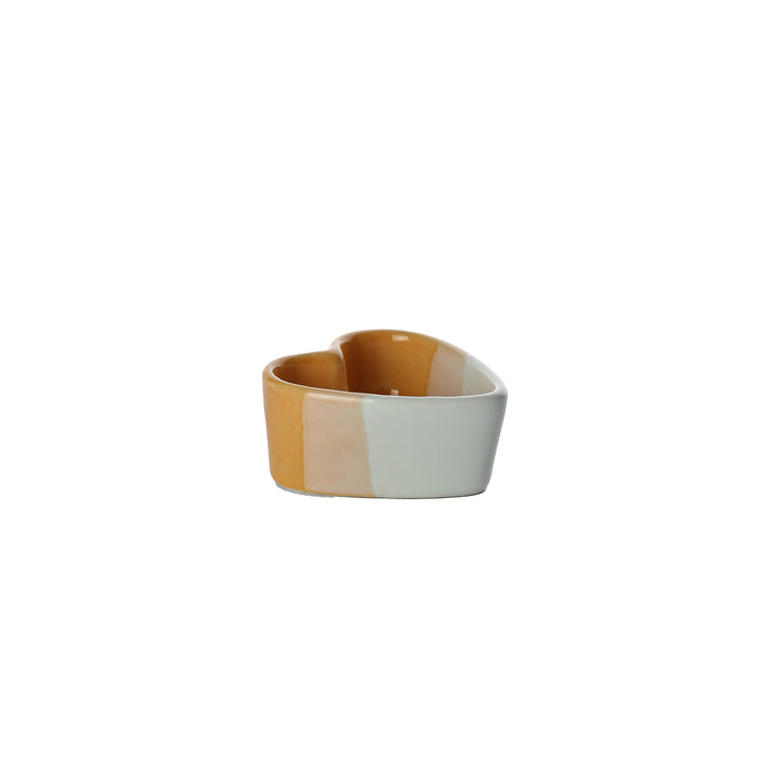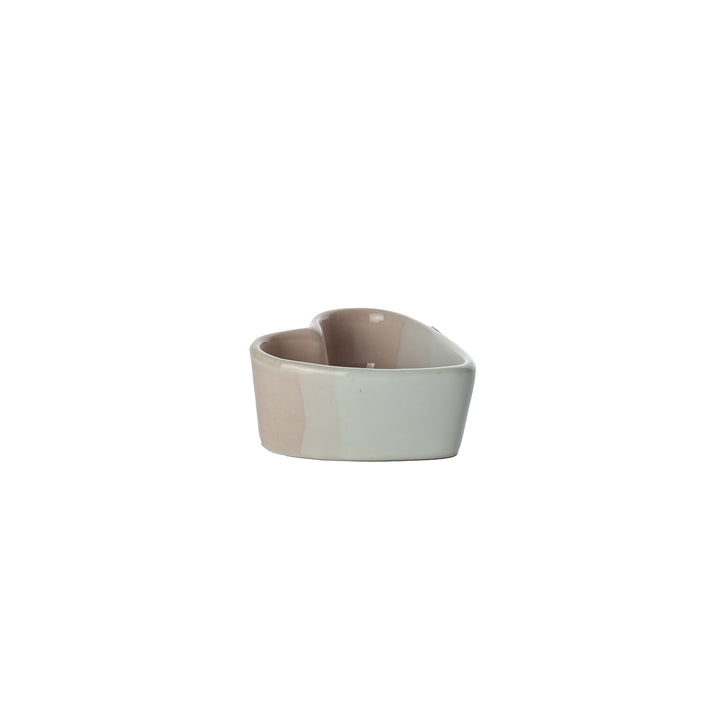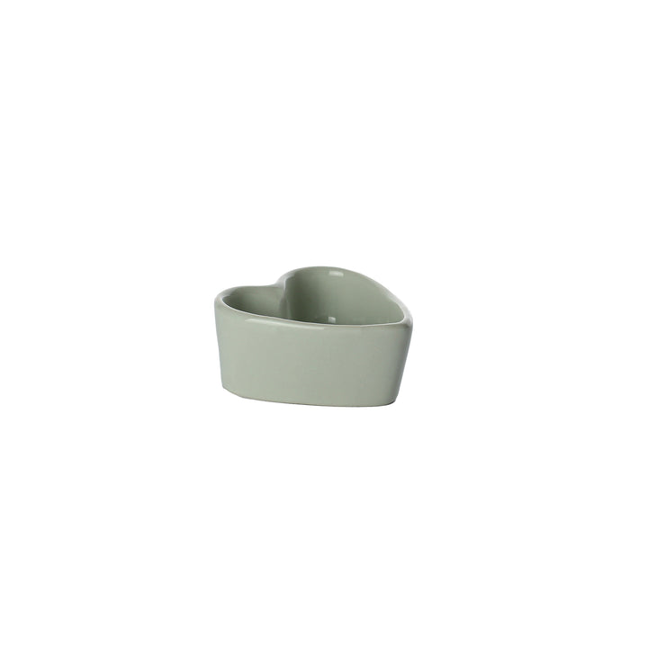رامكين سيراميك أو وعاء صلصة غمس ساحر على شكل قلب، يتميز بتصميم عصري بلونين من طلاء أخضر داكن وطلاء أبيض فاتح لامع. الجزء الخارجي مخدد عمودياً، مما يجعله مثالياً للتقديمات الفردية للبهارات أو الزبدة أو الحلويات.