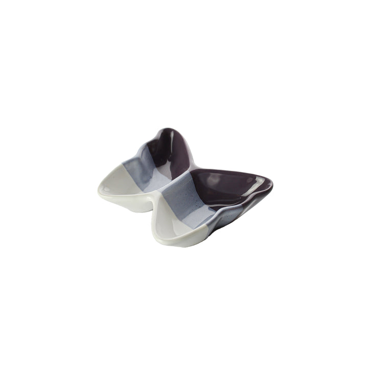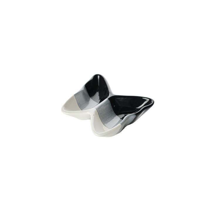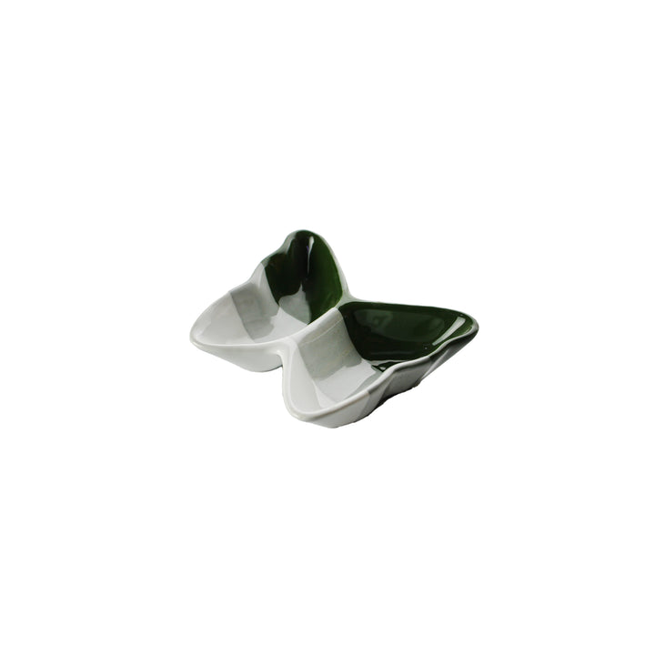 رامكين سيراميك أو وعاء صلصة غمس ساحر على شكل قلب، يتميز بتصميم عصري بلونين من طلاء أخضر داكن وطلاء أبيض فاتح لامع. الجزء الخارجي مخدد عمودياً، مما يجعله مثالياً للتقديمات الفردية للبهارات أو الزبدة أو الحلويات.