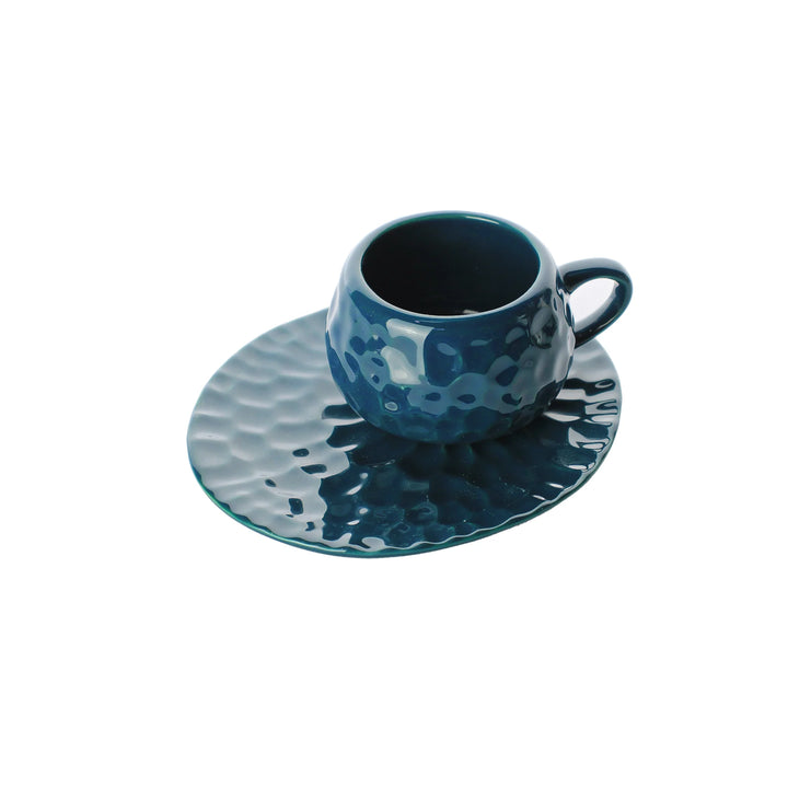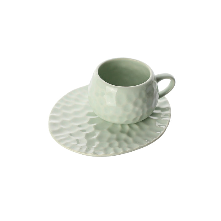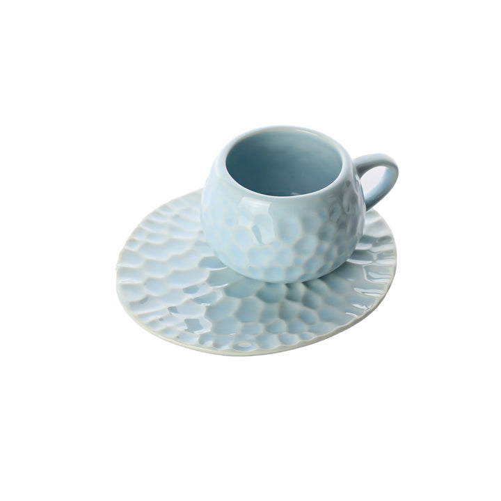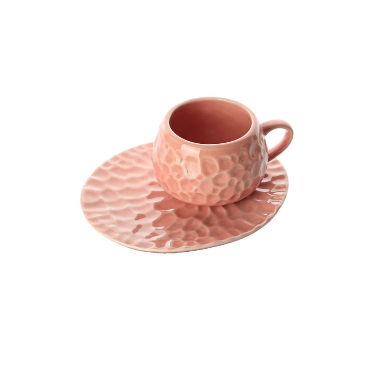 فنجان صغير بإحساس يدوي فاخر مع صحن مطابق، بلون وردي جذاب ولمسة مطرزة، مثالي لتقديم القهوة العربية أو الإسبريسو.