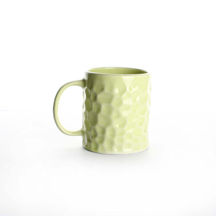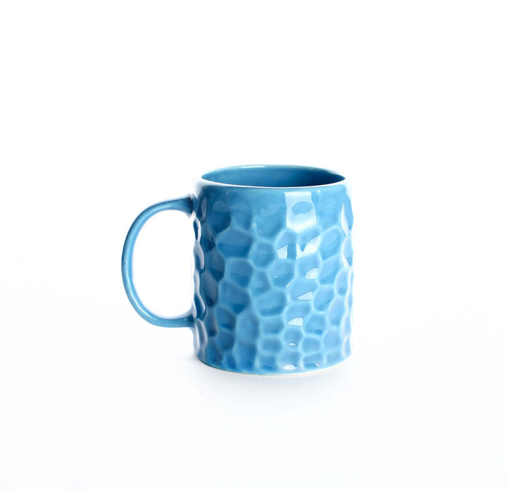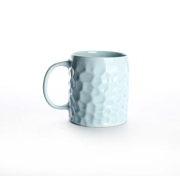 كوب أنيق بنقشة مطرزة سداسية، بلون أزرق سماوي ناعم، مناسب للقهوة أو الشاي.