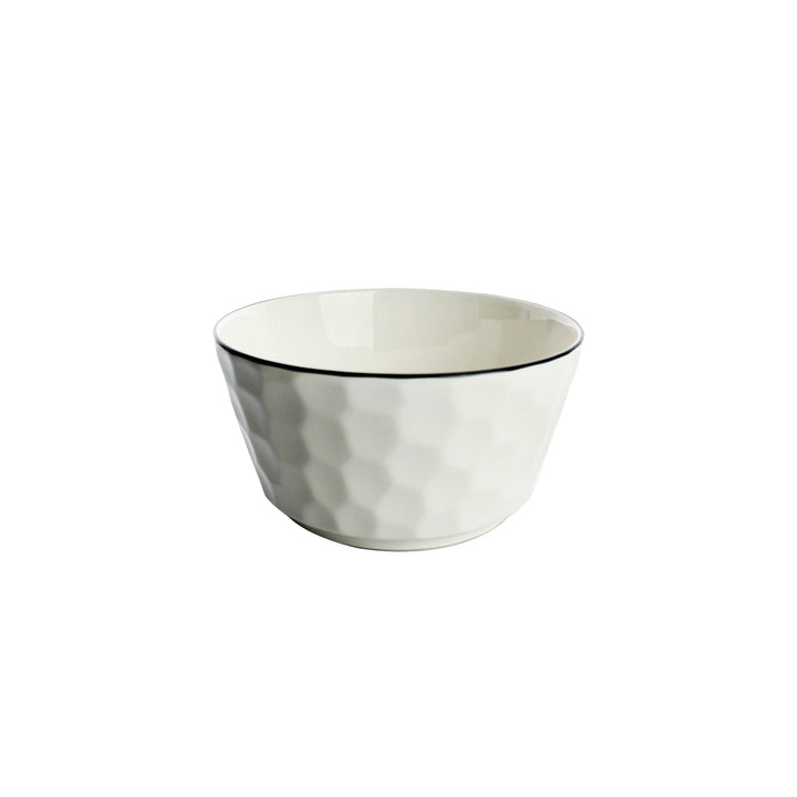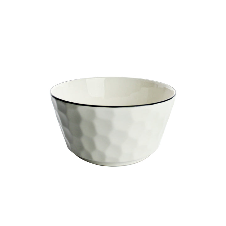 وعاء تقديم أو سلطة جانبي من السيراميك الأبيض الراقي يتميز بخارج مخدد مزخرف وحافة مطلية بالذهب. مثالي للمقبلات أو الحلويات أو الأطباق الجانبية الصغيرة، ويضيف لمسة من الفخامة إلى مائدتك.