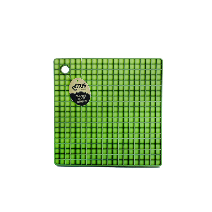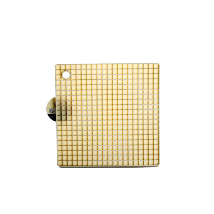 فرشة سيليكون مربعة بلون ذهبي/بيج ذات نمط شبكي بارز، تستخدم كحامل للأطباق الساخنة أو كفرشة مضادة للانزلاق.