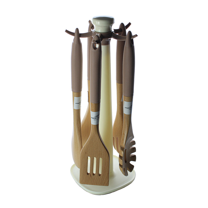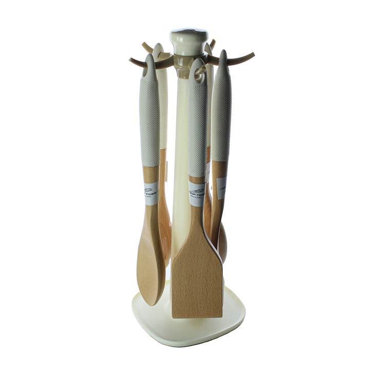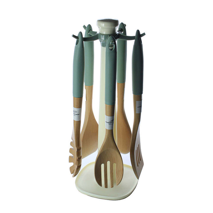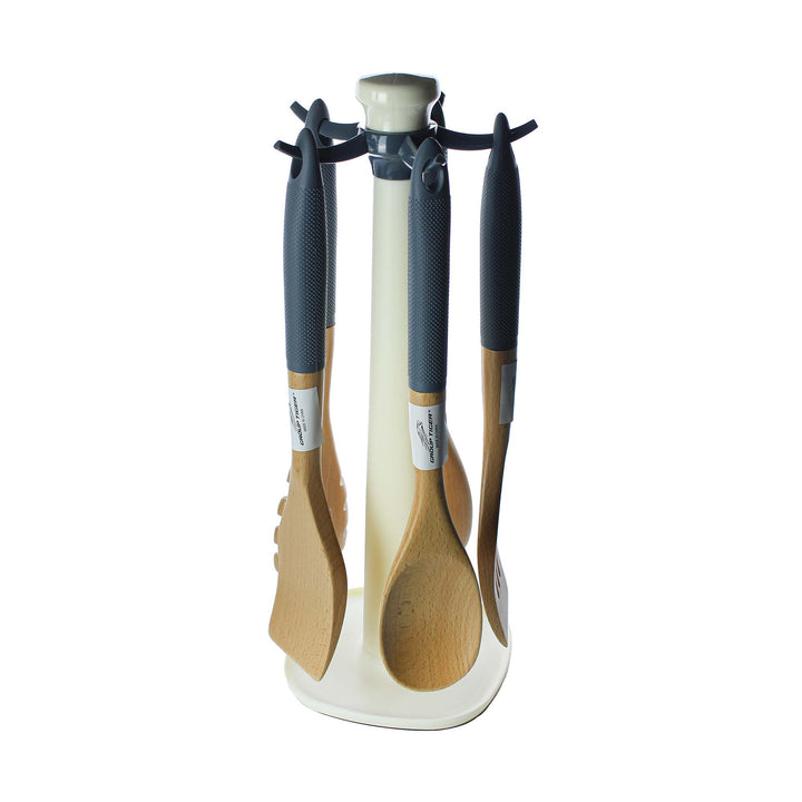طقم أنيق وعملي من ست أدوات مطبخ خشبية (ملعقة مسطحة، مغرفة، مصفاة، إلخ) بمقابض مريحة بلون رمادي. يتضمن حامل دوار قائم بذاته لسهولة الوصول والتخزين على سطح العمل. لطيف على أواني الطهي غير اللاصقة.