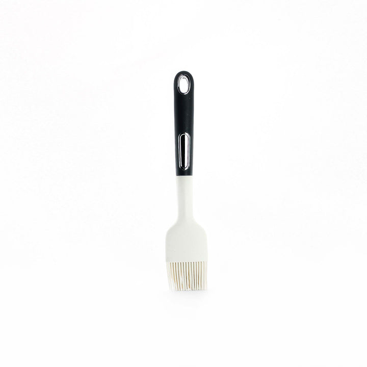 | فرشاة دهن صلبة من السيليكون باللون الأسود، تحمل علامة ، بمقبض طويل وشعيرات سيليكون ناعمة، تُستخدم للتلميع أو تزييت الطعام. |