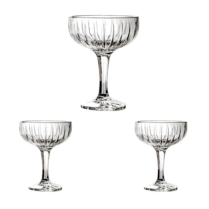 طقم راقٍ من الكؤوس ذات السيقان الطويلة التي تتميز بنسيج مضلع ومموج جميل. مثالية لتقديم الماء أو العصير أو النبيذ في حفلات العشاء أو المناسبات الخاصة. يضيف التصميم الفريد لمسة من السحر العتيق إلى إعداد طاولتك.