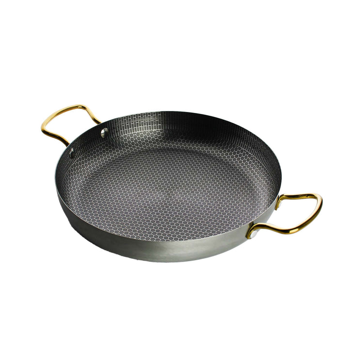 مقلاة واسعة وضحلة أو صينية على طراز البايلا مع نقش قرص العسل الداكن والملمس غير اللاصق على سطح الطهي ومقبضين حلقيين بلون ذهبي.