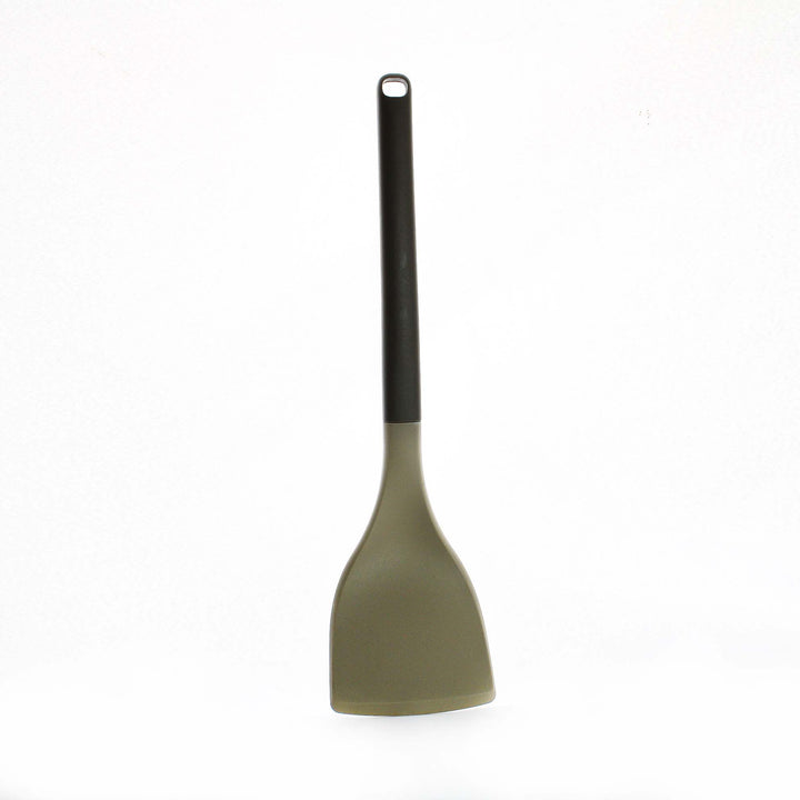 ملعقة مسطحة عريضة وصلبة برأس كريمي فاتح أو أبيض مائل للصفرة ومقبض خشبي، مناسبة للتقليب السريع أو مهام الطهي العامة.