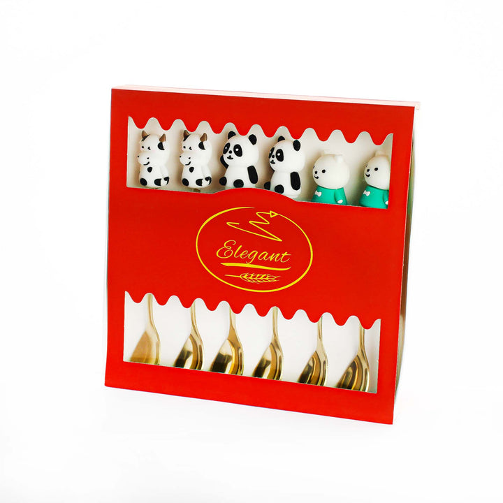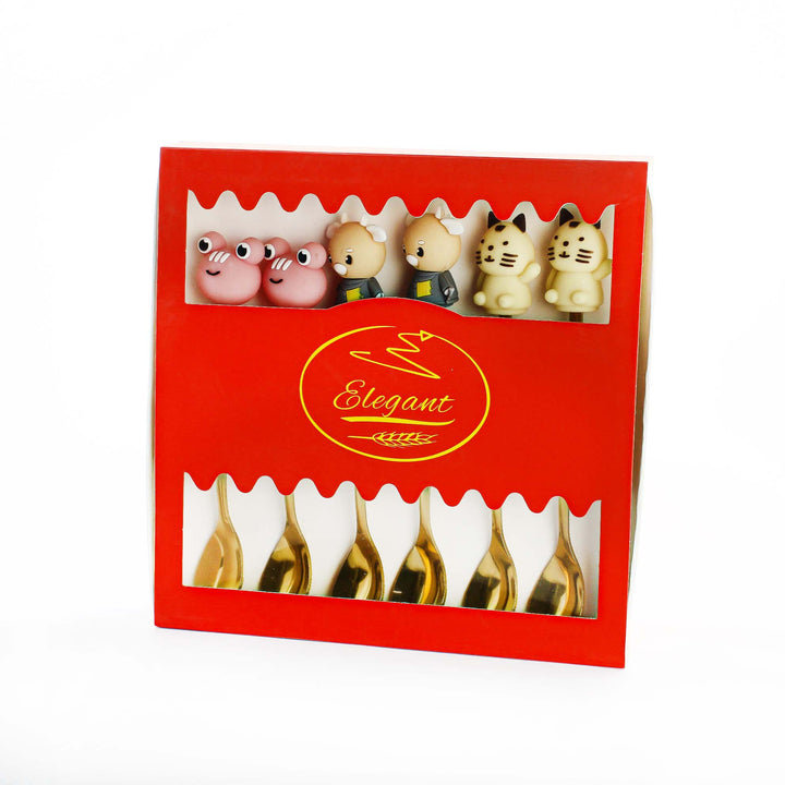 مجموعة زخرفية من ست ملاعق صغيرة ذات لون ذهبي مع شخصيات حيوانات متنوعة من السيراميك أو الراتنج (قطط وخنازير) مثبتة على المقابض، ومعبأة في صندوق أحمر.